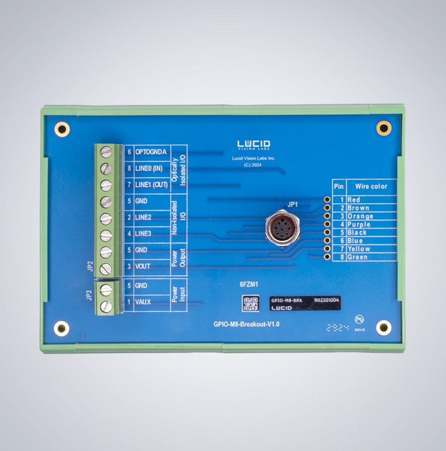 M8 GPIO 转接板(GPIO-M8-BRK-KIT001)兼容 Triton、Triton2、Atlas、Atlas IP67、Atlas10 和 Helios2 相机。该转接板便于 GPIO 接线和原型开发。每个套件均包含一根 1 米 GPIO 线缆,并兼容 DIN 导轨安装。